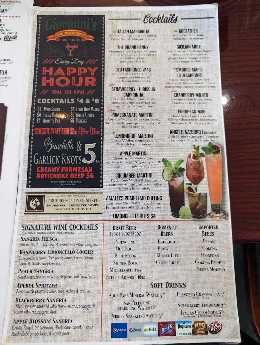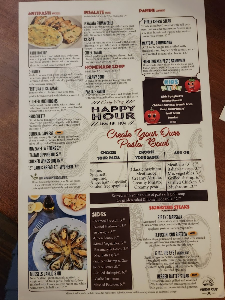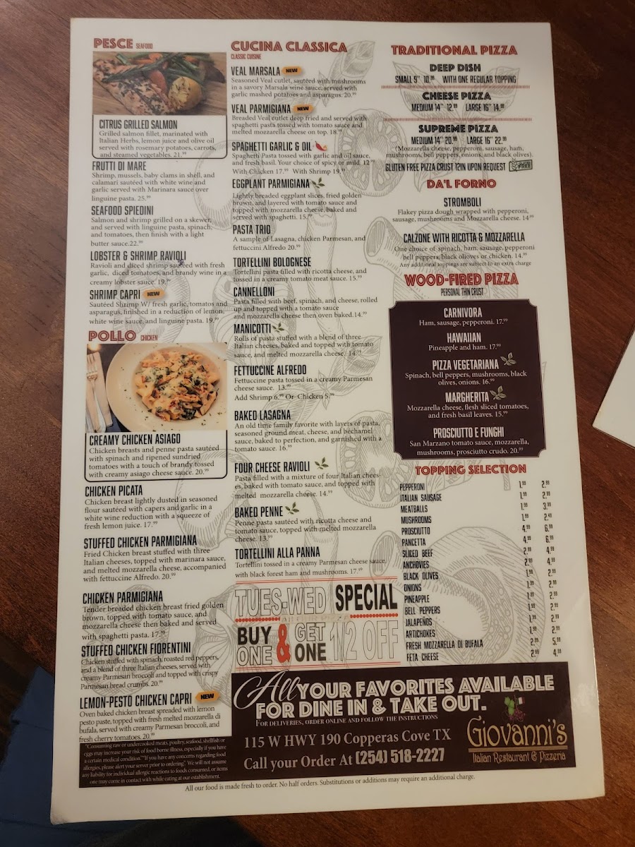 Welcome to Giovanni's Italian Restaurant & Pizzeria, a beloved gem nestled in Copperas Cove, TX. This charming eatery offers an authentic taste of Italy with a menu that celebrates classic flavors and fresh ingredients. Highlights include the delightful Ziti Campangnoli, featuring perfectly cooked noodles tossed with chicken, garlic, and vibrant spinach in a savory garlic oil sauce. For seafood lovers, the Seafood Spiedini brings a mouthwatering combination of grilled salmon and shrimp, showcasing the restaurant's commitment to healthy, delicious options.