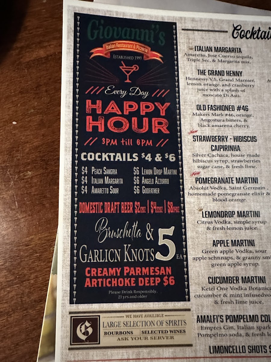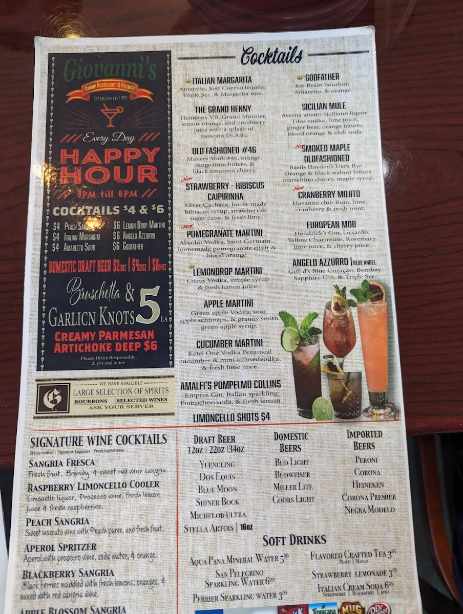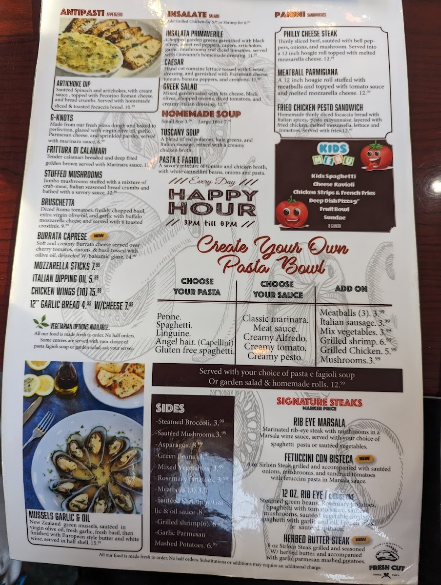 Welcome to Giovanni's Italian Restaurant & Pizzeria, a beloved gem nestled in Copperas Cove, TX. This charming eatery offers an authentic taste of Italy with a menu that celebrates classic flavors and fresh ingredients. Highlights include the delightful Ziti Campangnoli, featuring perfectly cooked noodles tossed with chicken, garlic, and vibrant spinach in a savory garlic oil sauce. For seafood lovers, the Seafood Spiedini brings a mouthwatering combination of grilled salmon and shrimp, showcasing the restaurant's commitment to healthy, delicious options.